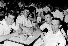 7 1961 West Pac Cruise - Lee Koski Photo Subic Bay EM Club Roger Beukema, Joe Hale, Lee Koski, Marine names unknosn |